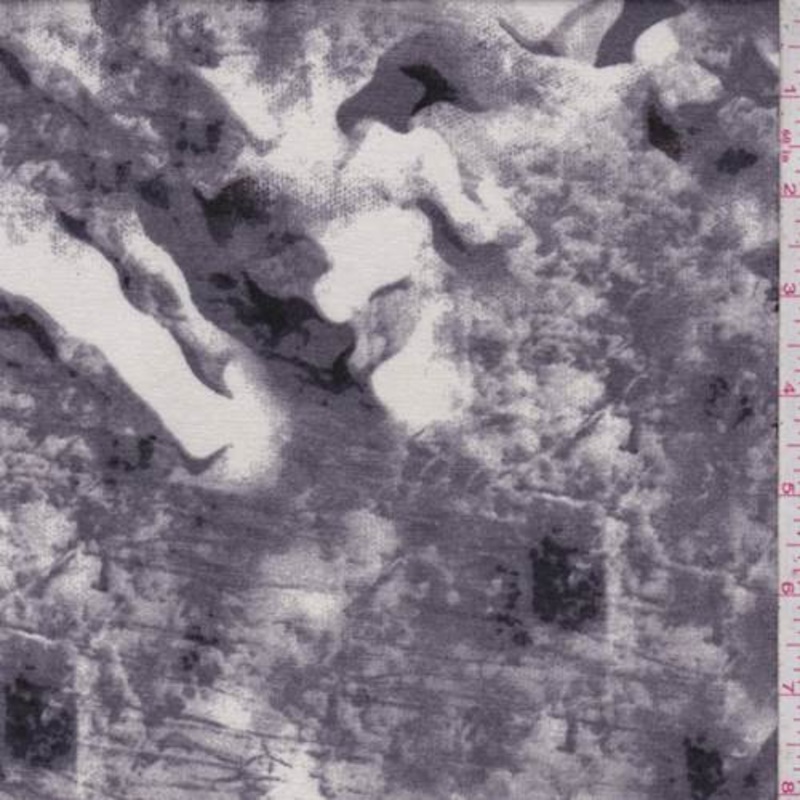 -Rayon jersey knit with a mottled patchwork print with baroque accents-97% Rayon 3% Lycra-Width: 60"-Weight: Lightweight-Transparency: Semi-sheer-Hand: Soft, brushed-Stretch: Slight across width and bias-Drape: Nice drape-Luster: Matte-End Uses: knit tops,
