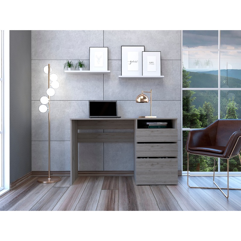 With its elegant and modern touch, the Dublin Three Drawer desk is a complete and compact solution for a small workspace.This desk is the perfect way to work from home. With three drawers( 4,13”H X 17,04”W 5,7”H X 18,22”W 11,41”H) for storage, it has plenty of room to keep your office supplies organized. The Light Gray finish gives it a modern look that will complement any home dcor.With ideal size (47,44”W X 17,08”D X 29,52”H)
