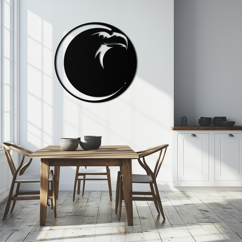 Channel the power and elegance of the eagle with this Eagle Moon Metal Wall Art. The striking silhouette of an eagles head emerging from a crescent moon creates a captivating piece of modern decor, perfect for homes, offices, and nature-inspired interiors. Made from 1.5mm premium steel, this artwork is electrostatically coated to resist rust and fading, ensuring durability indoors and outdoors.