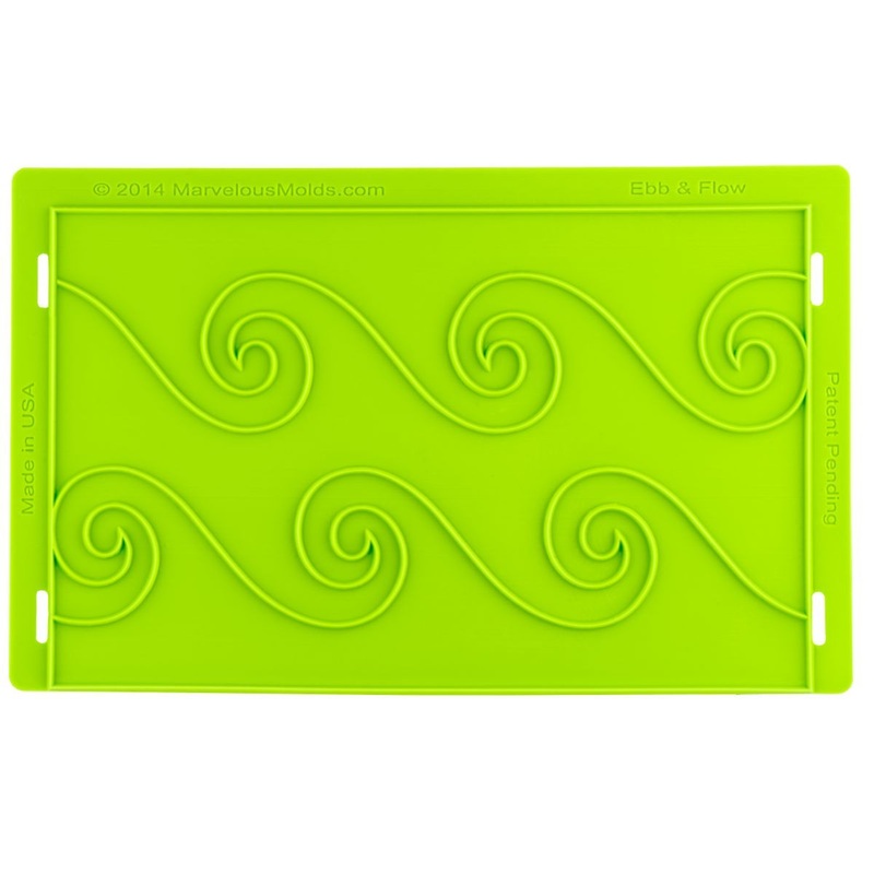 The Ebb & Flow Silicone Onlay mold creates a wave shaped pattern around a cake. Creating this distinctive design requires neither cutting nor skill; just fill the Silicone Onlay with fondant, gum paste or modeling chocolate. The design is applied in a similar fashion to a cake stencil, lining up perfectly with the application of each section. Save time and create professional results every time with this timeless design from Marvelous Molds.