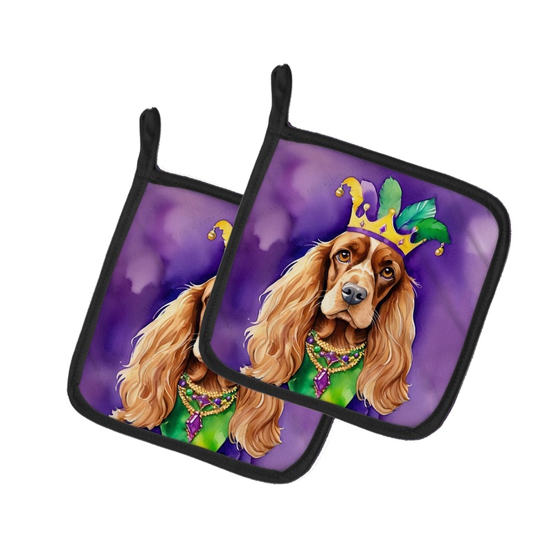 Pair of Pot Holders featuring breed specific English Cocker Spaniel artwork. Celebrate Mardi Gras with this Mardi Gras Pair of Pot Holders. A Pair of Pot Holders to match your kitchen decor. Made in the USA these are thick and functional. Full color artwor
