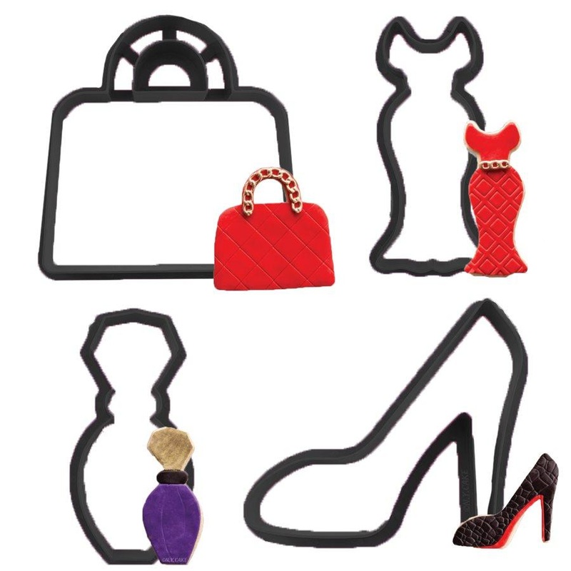 These fashion cutter sets are made of food approved plastic. May be used for cookies, fondant, gumpaste, chocolate modeling paste, marzipan & more!Cutters include a Stiletto High Heel, Perfume Bottle, Ladies' Dress and Designer Purse.Set of 4Cookie Cutter