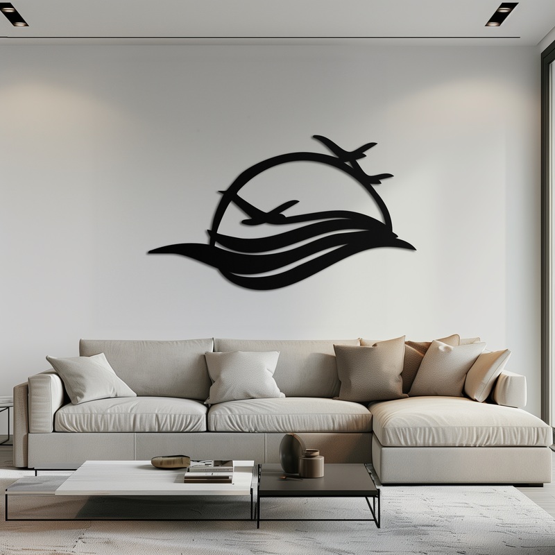 Bring a sense of calm and nature into your home with this stunning flying birds over sunset metal wall art. Featuring elegant silhouettes of birds soaring above stylized waves and a setting sun, this piece adds a tranquil and modern vibe to any room. Craft