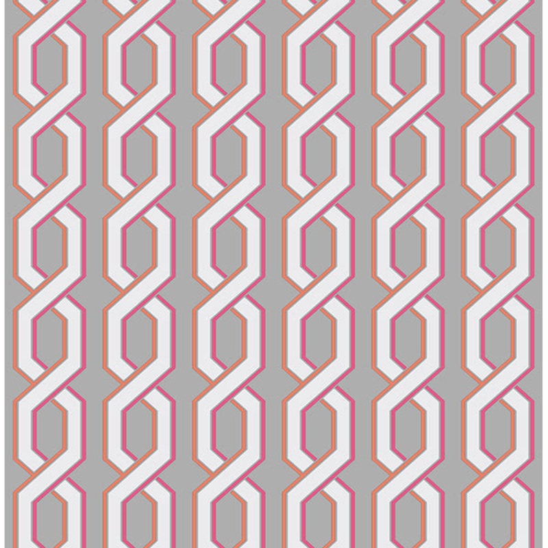 Bright pink and orange are tempered by a cool grey and white. This modern wallpaper features a trellis pattern. Printed with raised inks, the helix geometric really pops.