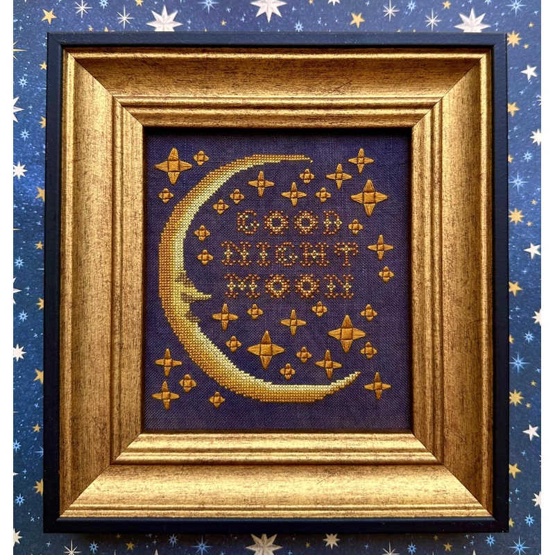 First up is Good Night Moon. This piece was inspired by the wonderful children’s bookGoodnight Moonby Margaret Wise Brown. It was certainly one of my favorite books to read to Liz when she was a little girl and definitely one of her favorites as well!Our model was stitched on 40-Count Fossil from Fox and Rabbit using one strand of Needlepoint Silk over two threads of linen. The many stars in this design are straight stitched. As are the moon’s eyelashes. I’ve provided close-up illustrations on the chart page. I very purposely chose Fox and Rabbit’s Fossil linen as it is a near-black color that is actually easy on a stitcher’s eyes.The stitch count is 89 Wide by 97 High. (Which means this design is much smaller than my other Moon designs.)Needlepoint Silks used are: 471, 472, 473, 474, 475, 476, 912. As always, a conversion to DMC is provided.