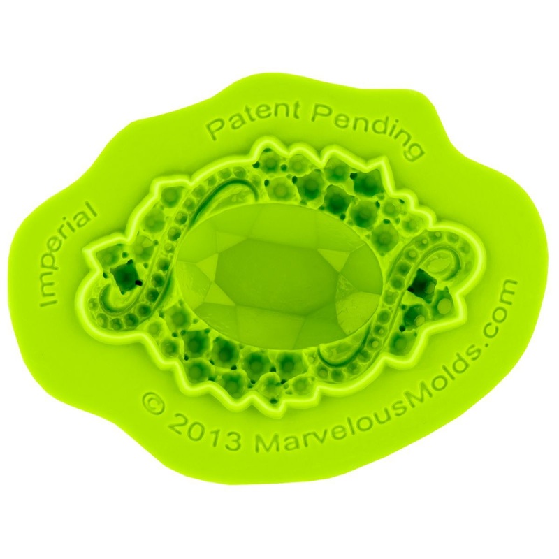 Imperial Jewel Brooch Mold is an attention-grabbing, jewel, silicone mold from the Marina Sousa collection. Its shining star is its center oval stone which is surrounded by a setting of swirling strands of smaller stones. Imperial makes a gorgeous center for a fondant bow or accent atop a fondant swag. Imperial is beautiful in fondant, stunning in Isomalt and perfectly formed with any medium on account of the molds flexibility and unique cutting blades. Add that special touch to your cakes, cookies, cupcakes and more with this celebrity style brooch mold.