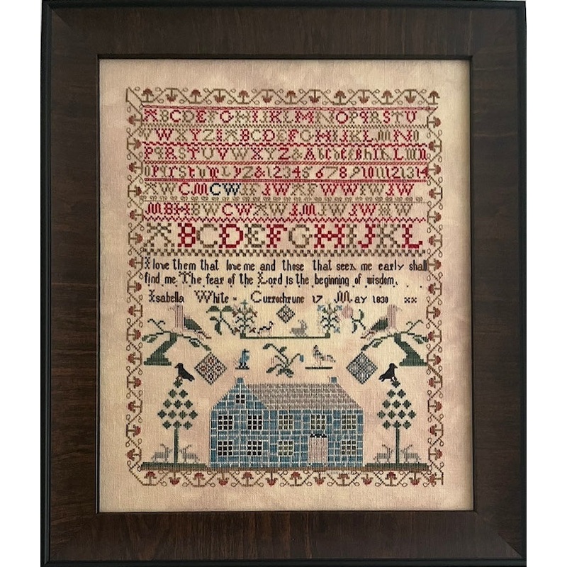 In May of 1830, Isabella White stitched her sampler. The lettering trees, and house are examples of motifs displayed in Sottish samplers.Design size: 195 (w) x 245 (h)Model stitched on 40 ct. Fox and Rabbit "Inca" with Weeks Dye Works floss. (DMC equivalen