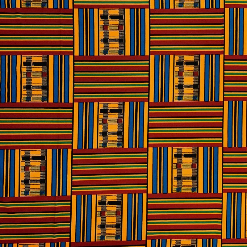 This kente inspired printed DTY fabric has a vibrant array of patterns and colors. It consists of many geometrical patterns such as trapezoids, squares and even colorful lines. The colors this print contains are orange, red, black, green, and turquoise. With this unique blend and african inspired look, its no wonder this fabric is timeless and beautiful!