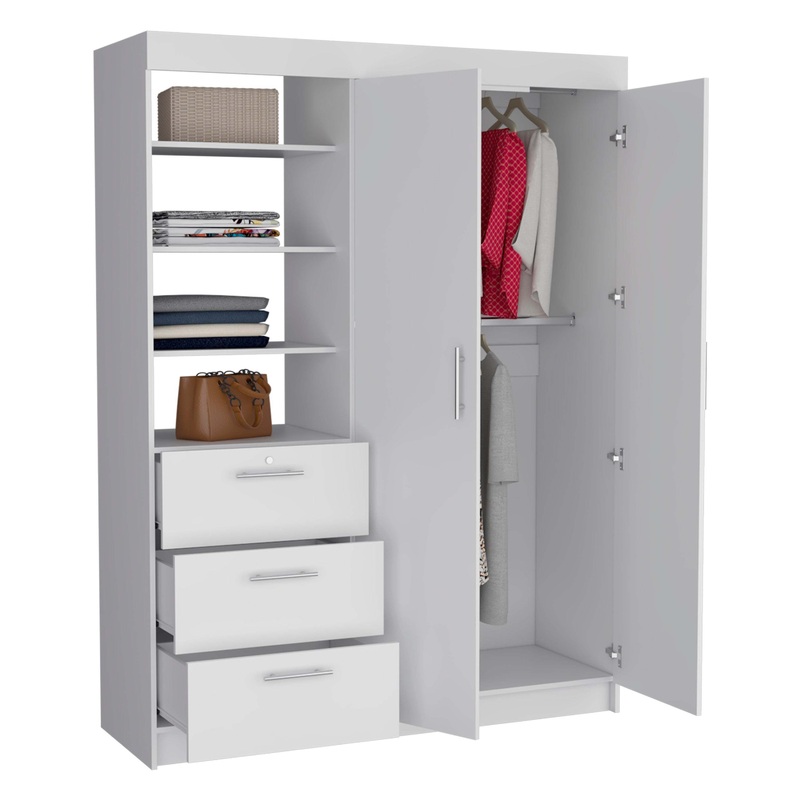 We know you like your comfort, so we created the perfect solution for storing all your clothes in one place- the Kenya 3 Drawers armoire! This armoire is ideal for small spaces and adds a modern touch to any room. The closet features two wide doors, two interior hangers, and three spacious drawers for all your clothes. The best part? Three 3-Tier Shelf that are perfect for displaying your favorite accessories or items!Designed with an elegant white manufactured wood finish.Dimensions:Height: 79″ Width: 59Depth: 20,4Furniture Type: Ready to assemble (full assembly required).Certifications: CARB phase II compliant TSCA Title VI Compliant.Warranty: 1-year warranty coverage in wooden parts- 1-year warranty coverage in hardware pieces since its manufacturing date found in the lot number printed in the product box.
