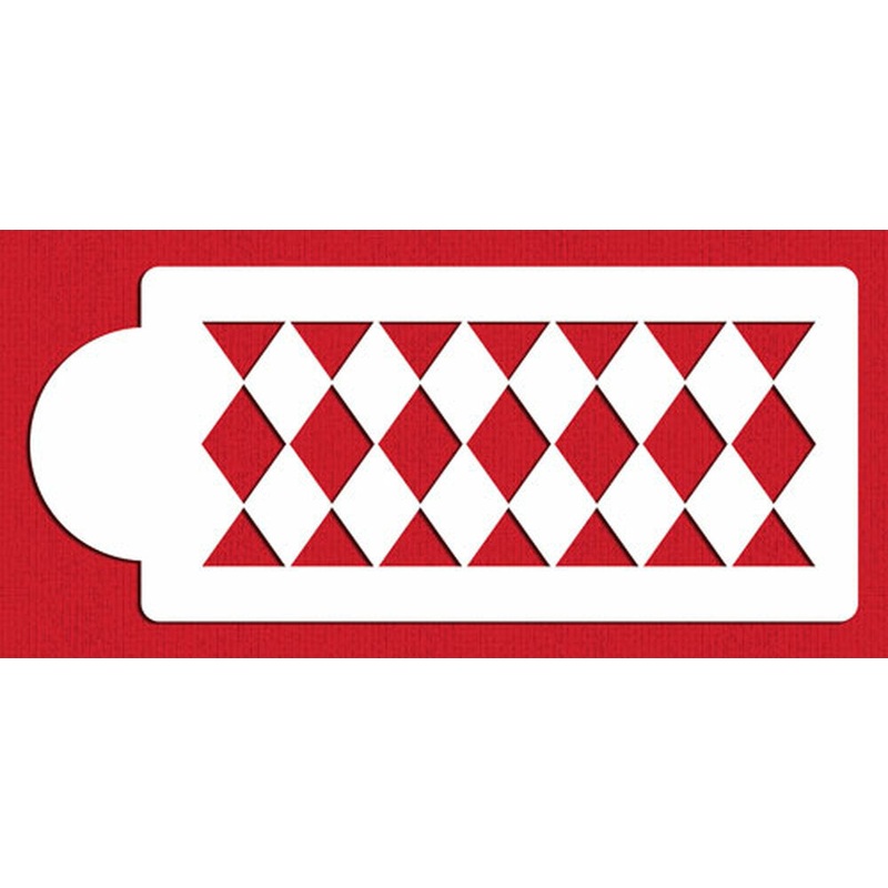 This versatile harlequin cake stencil pattern is perfect for sides of cakes. The overall design measures 4"H x 10"W and each individual diamond is 2"H x 1.4"W. The stencil is cut on 10 mil, durable food-grade plastic.