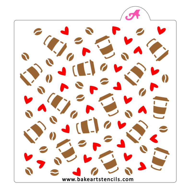 BakeArts Stencils’ Latte Love Pattern Cookie Stencil features coffee cups, hearts and coffee beans!