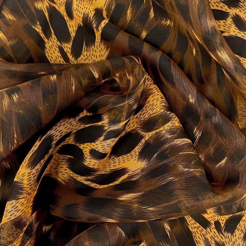 This unique chiffon fabric is 44/45" wide and is 100% polyester. It is a sheer, soft-touch woven fabric that is very lightweight. This chiffon fabric is covered in an elegant leopard print pattern. The leopard print pattern runs horizontally and flows very