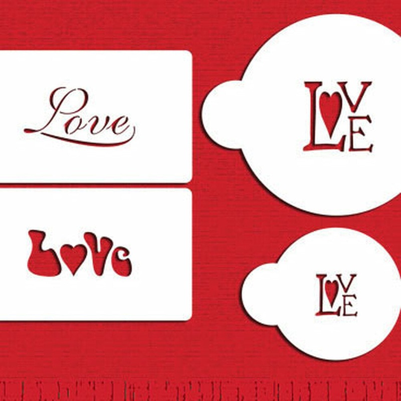 These four love cake and cookie stencils are cut out of a 10 mil, durable, food grade plastic. Patterns are 1.25"H x 2.5"W; 1" and 2" round