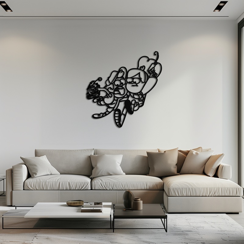 Bring the mystery and adventure of Gravity Falls to your home with this Mabel and Dipper Pines metal wall art. This design features both siblings in a dynamic and playful silhouette, capturing their iconic personalities and adventurous spirit. Perfect for Gravity Falls fans, this piece adds a unique, nostalgic touch to any space.