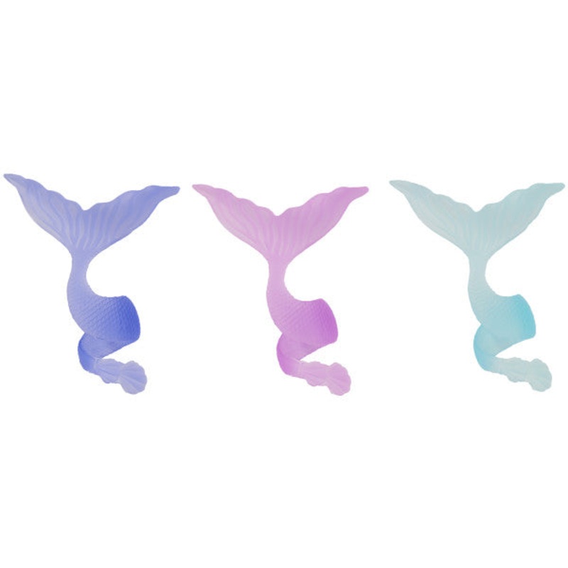 Add to a child's mystical party with these fun mermaid tail rings. Assortment comes in blue, pink, and purple colored rings. Great for cupcakes, donuts, or even finish off the look of a cake.Dimensions:Teal Tail: 2.15 x 1.65 x 0.75 inchesPink Tail: 2.1 x 1