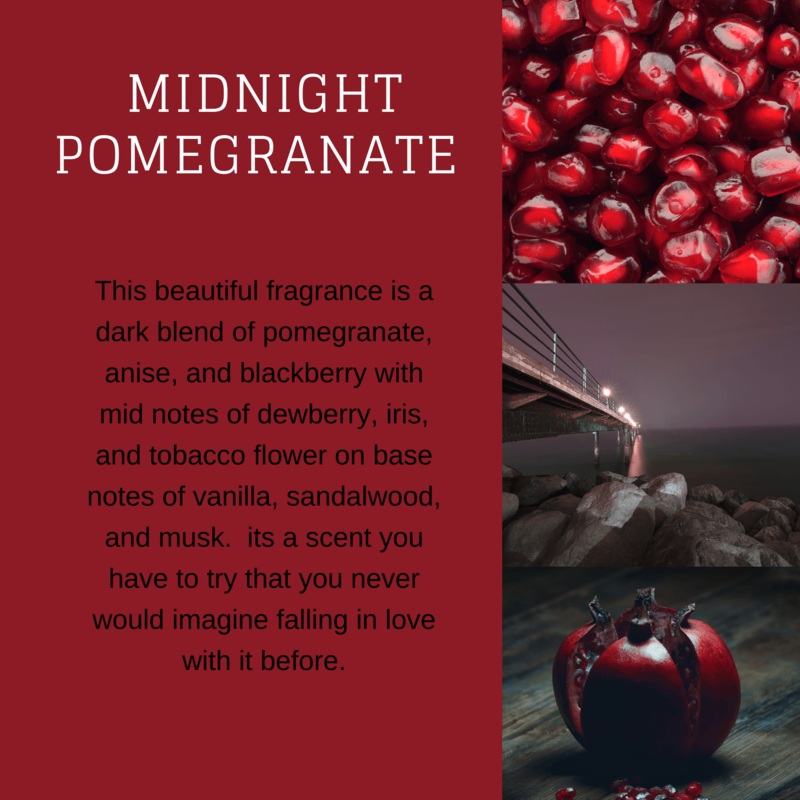 Midnight Pomegranate is a beautiful fragrance that is a dark blend of pomegranate, anise, and blackberry with mid notes of dewberry, iris, and tobacco flower on base notes of vanilla, sandalwood, and musk. It's a scent you have to try that you never would