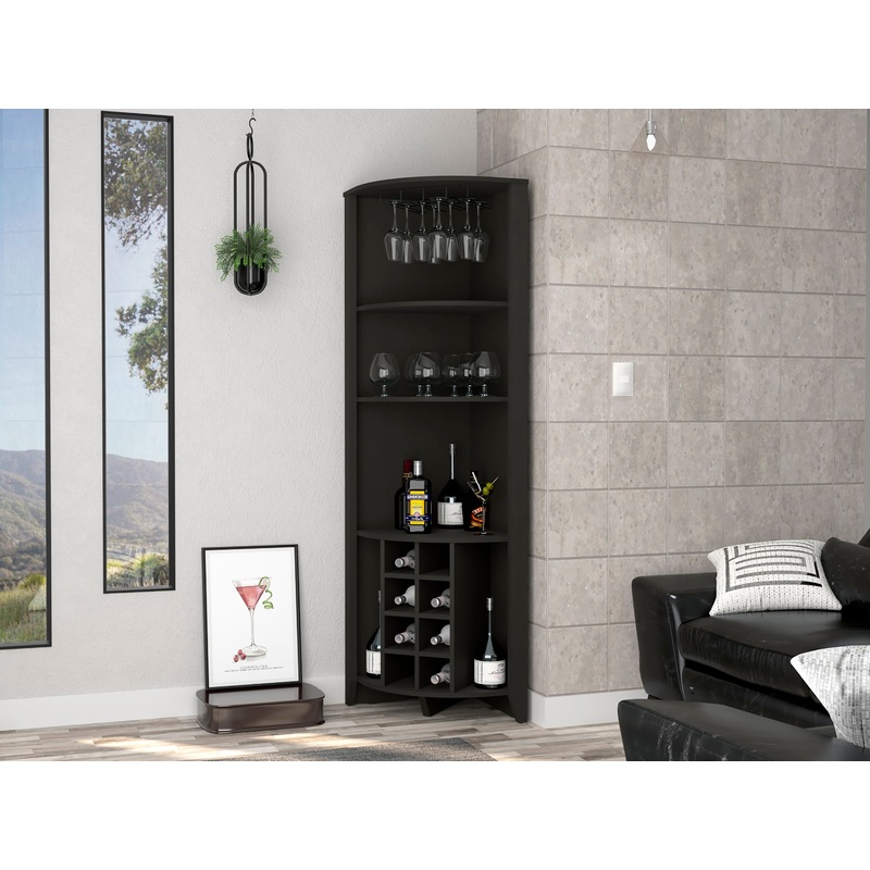 The Morgana Corner Bar Cabinet will impress your guests with three shelves, eight wine bottle racks, and a cup rack ideal for your glasses. Plus, its elegant contemporary design will add a touch of sophistication to any room. Made of solid and resistant manufactured wood, perfect for any space.Set includes: One (1) corner bar cabinetDimensions: 71.1 inches high x 19.2 inches wide x 19.2 inches deepFinish Color: Black WengueMaterials: Manufactured woodNumber of shelves: 5-ShelfWine cabinet capacity: 8-Bottle Cup rackEight wine cubbies 4.4″Three shelves 15.5″ H x 11.8″ H x 17.7″ H Two lateral shelves 19.5″ H x 5.4″ W