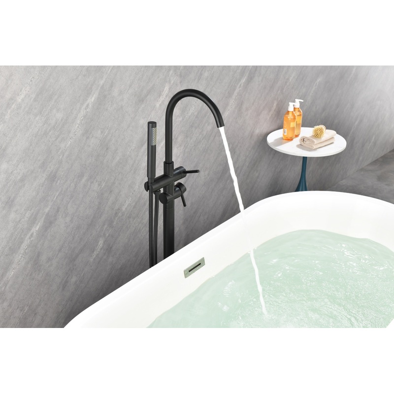 Mount Bathtub Faucet Freestanding Tub Filler Matte Black Standing High Flow Shower Faucets with Handheld Shower Mixer Taps Swivel Spout All Metal ConstructionWater Use Information: 1.61gpm 6.12L/min Solid brass,constructed from the high quality solid brass and brushed nickel finished in corrosion and rust-resistant for durability and reliabilityFunctions360 Degree Swivel Spout, Handheld Shower with 59″(150cm) shower hose will help to rinse down the tub or rinse off after a bath,very convenient to clean.Come with a diverter knob, switch between tub spout and hand showerInstallationFloor mounted, Include all the installation hardware.