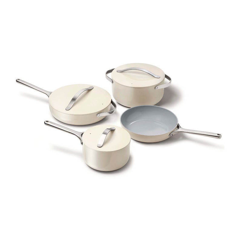 All Caraway pot and pan sets are free of PTFE, PFOA, PFAS, lead, cadmium and other toxic materials that can leach into your food, making them safe for you, your family, and the environment.