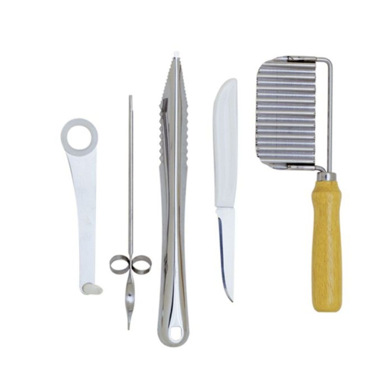 Set includes twin-curl cutter for fruit or vegetable curls of contrasting colors, spiral slicer for spiral ribbons, "v" cutter for zigzag edges, flex knife for blade tip control and crinkle cutter.The twin-curl cutter is chromed wire, all other pieces are