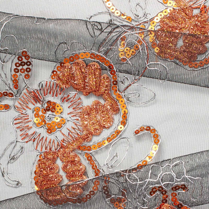 Use Orange Floral Sequins On Black Mesh fabric to create stylish apparel or home decor items. Sold by the yard at wholesale prices, shop Orange Floral Sequins On Black Mesh fabric today!