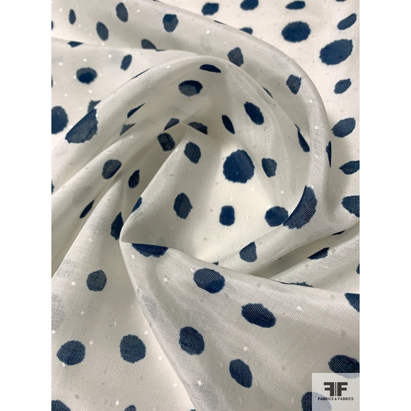 Painterly Polka Dot Printed Dobby Cotton-Silk Voile – Navy-Teal / Off-White Fabric by the Yard