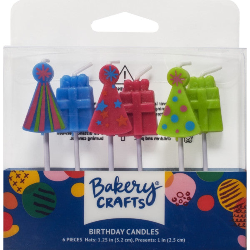 You will love to add a pop of color to your cake with these fun and brightly colored party hats and presents. Ideal for birthday cakes, cupcakes and more. Assortment includes blue, pink, and green shaped candles.Dimensions:CANDLE (6): 0.65 x 0.4 x 3.05 inc