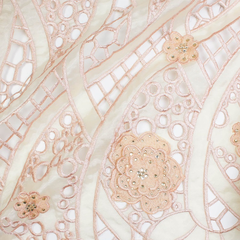 Peach hand cut embroidery organza lace with sequins is 52" wide and 100% polyester. Use this to design a dress, or decorate your tables/chairs to create elegant decor that your guests will never forget. It can be used for evening gowns, dresses, draping, c