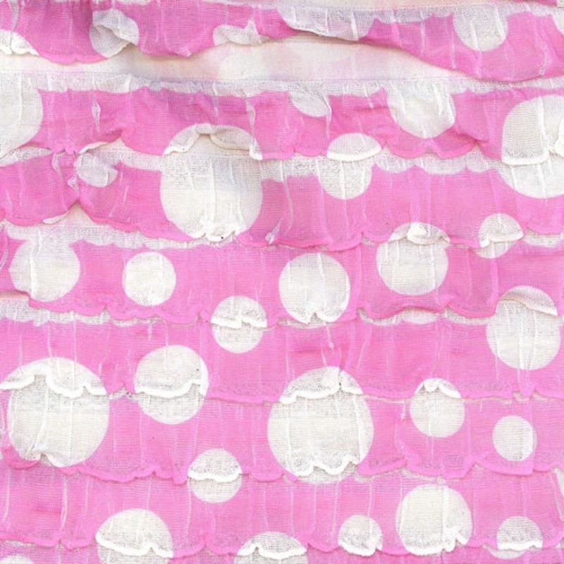 Polyester/Spandex, 44/46" wideThis pink and white printed ruffle jersey knit is perfect for fun dance wear, special occasion apparel, costumes and club wear. It can also be used for a wide variety of children's clothes. The random sized dots add to the bea