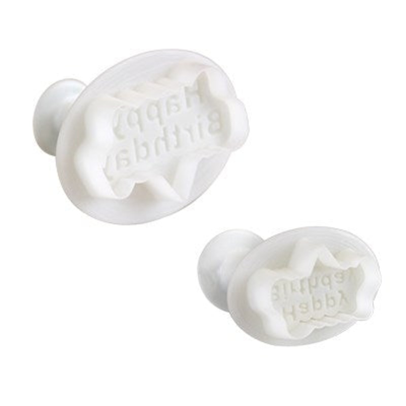 Set of 2 Happy Birthday Plunger Cutters - M/LCreate happy birthday plaques with ease and efficiency!These plunger cutters are a great way to cut out decorations for cupcake toppers.To wash use warm soapy water.Dimensions:Large 29mmMedium 48mm