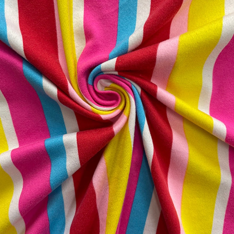-Red, White, Turquoise, Neon Pink, Yellow, & Light Pink Uneven Vertical Print Stripe Double Brushed Knit Fabric-96% Polyester 4% Spandex-Width: 60"-Weight: Light-Transparency: Opaque-Hand: Smooth,Soft-Stretch: Moderate Four-way Stretch-Drape: Good Drape-Lu