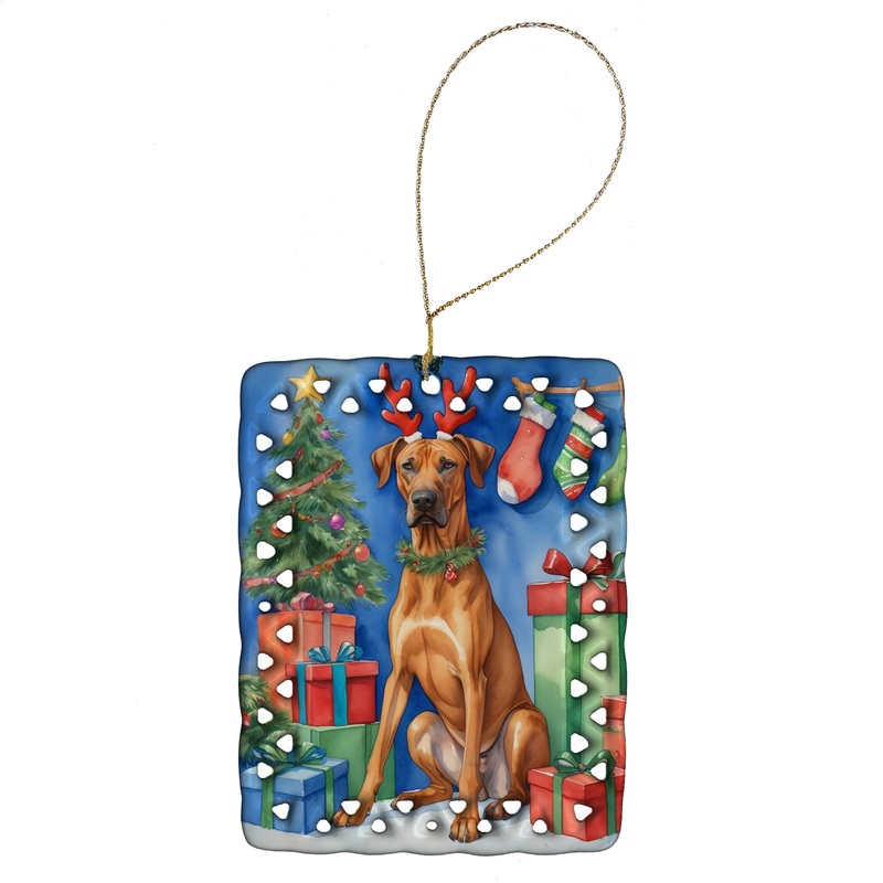 Porcelain Ornament featuring breed specific Rhodesian Ridgeback artwork. Celebrate Christmas with this Christmas Ornament. Add a unique, personal touch to your holiday decor with our Rectangular Lattice Porcelain Ornament. Perfect for creating cherished memories, this high-quality ornament shines under festive lights, reflecting warmth and joy throughout your Christmas tree. Crafted with a glossy finish, it showcases vibrant, full-color artwork contributed by our talented artists, ensuring your tree is adorned with a burst of color and holiday spirit. What sets this Porcelain Ornament apart is its customizable white back. Use a paint pen or permanent marker to write a heartfelt message, commemorate a special year, or mark an unforgettable date, turning this ornament into a keepsake that will be treasured for years to come. For best results, allow any personalization to dry thoroughly before handling. Each ornament comes complete with a delicate gold cord, making it easy to hang and display. Proudly made in the USA, this ornament measures 3.375 x 2.625 inches and is a thoughtful gift for pet sitters, teachers, family members, or anyone who would appreciate a little extra holiday magic. Bring style, charm, and a touch of personal meaning to your Christmas tree with this beautifully designed ornament..