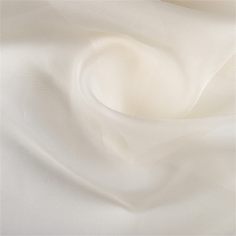 Solid Eggshell Silk Organza Fabric from our Runway Silk CollectionSheer, thin open weave fabric that is heavier and crisper than silk gauze. It has a smooth, flat finish, is strong and durable, and gets it stiffness from tightly twisted yarns. Often used a
