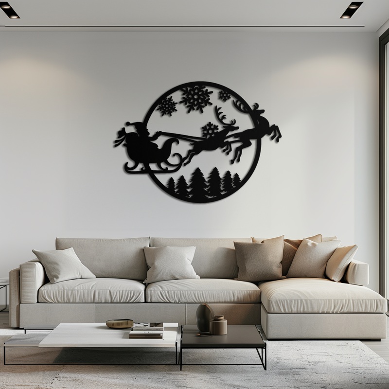 Celebrate the magic of Christmas with this Santa Sleigh Metal Wall Art! Featuring a beautifully detailed design of Santa Claus riding his sleigh, pulled by flying reindeer and surrounded by delicate snowflakes, this metal decor adds a festive and cozy holi