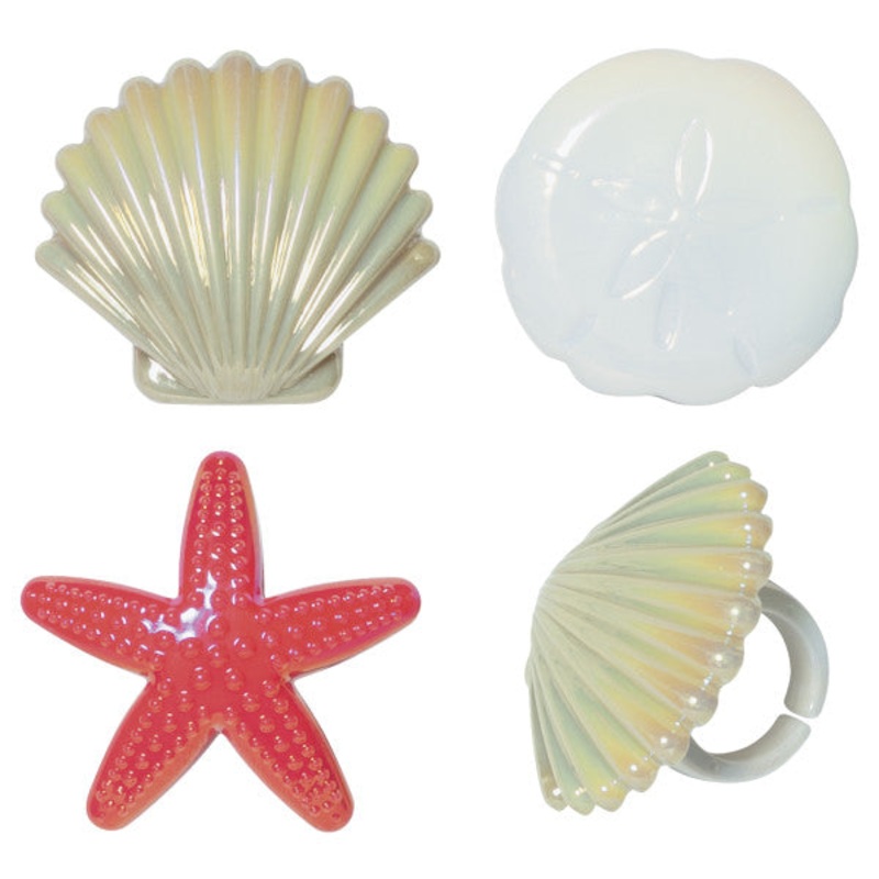 Finish off a beach and sea themed party with these iridescent rings. Assortment includes sea shells, starfish, and sand dollars. Great for cupcakes, donuts, or even finish off the look of a cake.Dimensions: