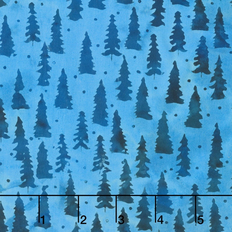 Simple outline of dark blue batik fir trees and dots tossed on a medium blue background. Add beautiful blue batiks to your winter and holiday projects! The Snowfall Batiks line from Island Batiks combines icy blue and frosty white in a collection that capt