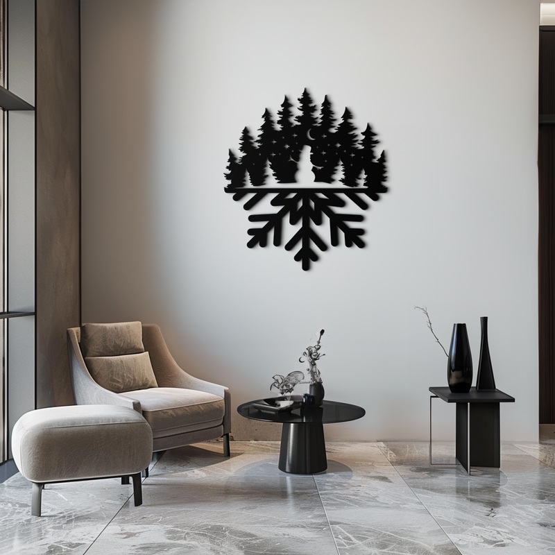 Celebrate the serene beauty of winter with this Snowflake Forest Metal Wall Art. Featuring a magical tree silhouette above a bold snowflake shape, this design perfectly blends the calm of a snowy forest with geometric elegance. Ideal for those who love winter, nature, and meaningful wall art.