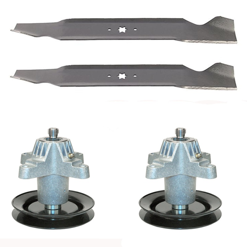 42″ DecksAdditional Information: (2) Spindle Assembly with PulleyTech Info:6 pt. star designHeight6 1/8″Pulley Outer Diameter5 1/2″Includes:Mounting bolts, blade bolt and pulley nutReplaces Part Numbers: 618-04474, 918-04474B, 91804474B, 918-04474A(2) Hi Lift Standard Mower BladeC to C 2-1/2″Center Hole “H” pattern fits 6 star patternLength 21-3/16″Thickness .156Width 3″Replaces Part Numbers: 942-04312, 942-04308, 942-04312, 942-04308, 942-04312, 942-04308