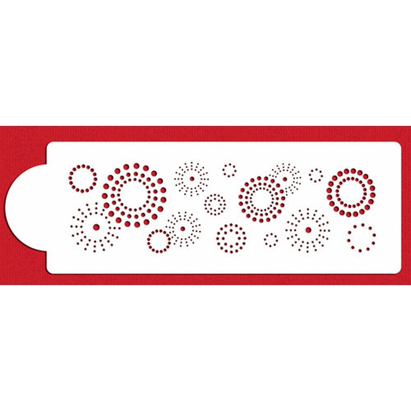 This circle cake stencil pattern creates a whimsical look with its varying size starbursts (ranging from .62" - 2.8" across). Total pattern measures 4"H x 14.5"W and is made from durable 10 mil, food-grade plastic.