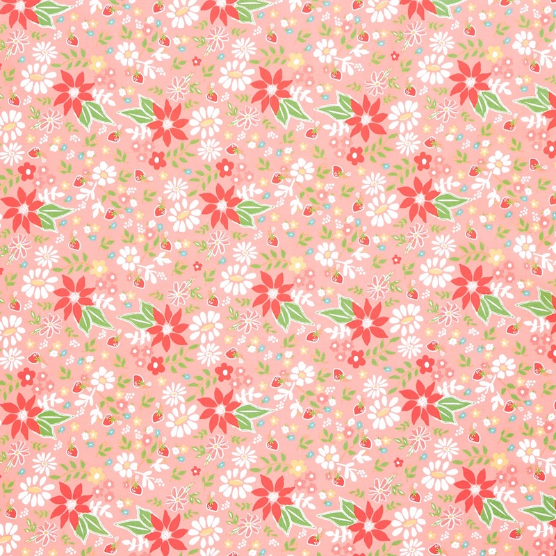 Red strawberries and red and white flowers on a pink background. Looking for something refreshing? Strawberry Lemonade by Sherri & Chelsi for Moda Fabrics is a cheerful fabric collection with a retro flair. This collection features flowers, gingham, dots,