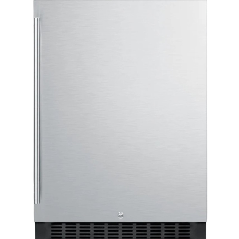 Sized with a convenient 24" footprint, the FF64BSS refrigerator can be used built-in or freestanding. It has a black cabinet with a sealed back. The reversible stainless steel door includes a factory installed lock and a professional style handle. Inside,