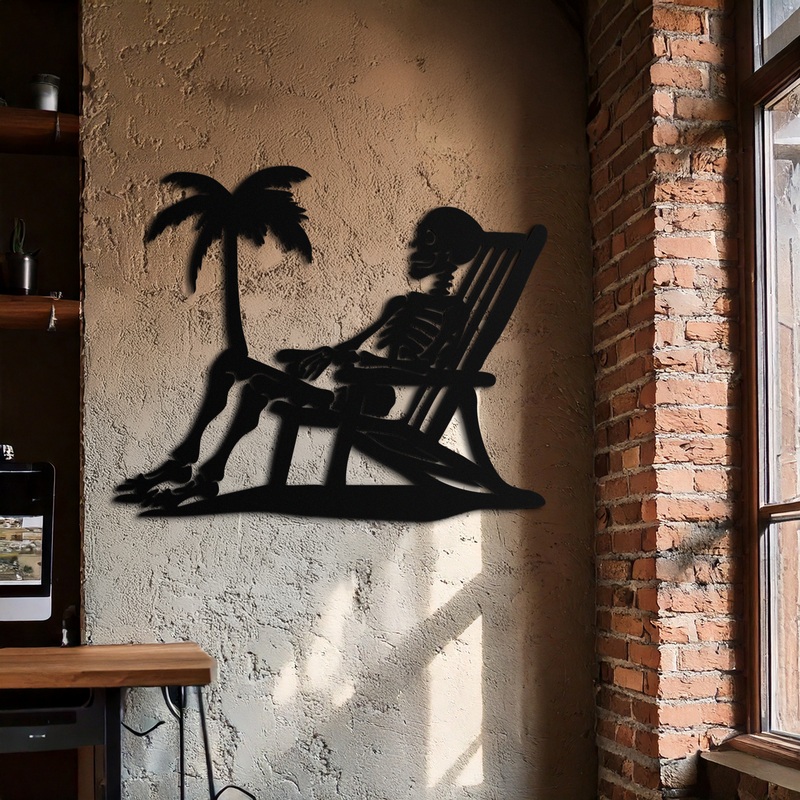 Add a quirky and bold twist to your space with this Sunbathing Skeleton Metal Wall Art. Featuring a skeleton lounging in a beach chair under a swaying palm tree, this humorous yet artistic piece blends tropical relaxation with gothic charm. Perfect for beach homes, unique interior themes, or Halloween lovers.