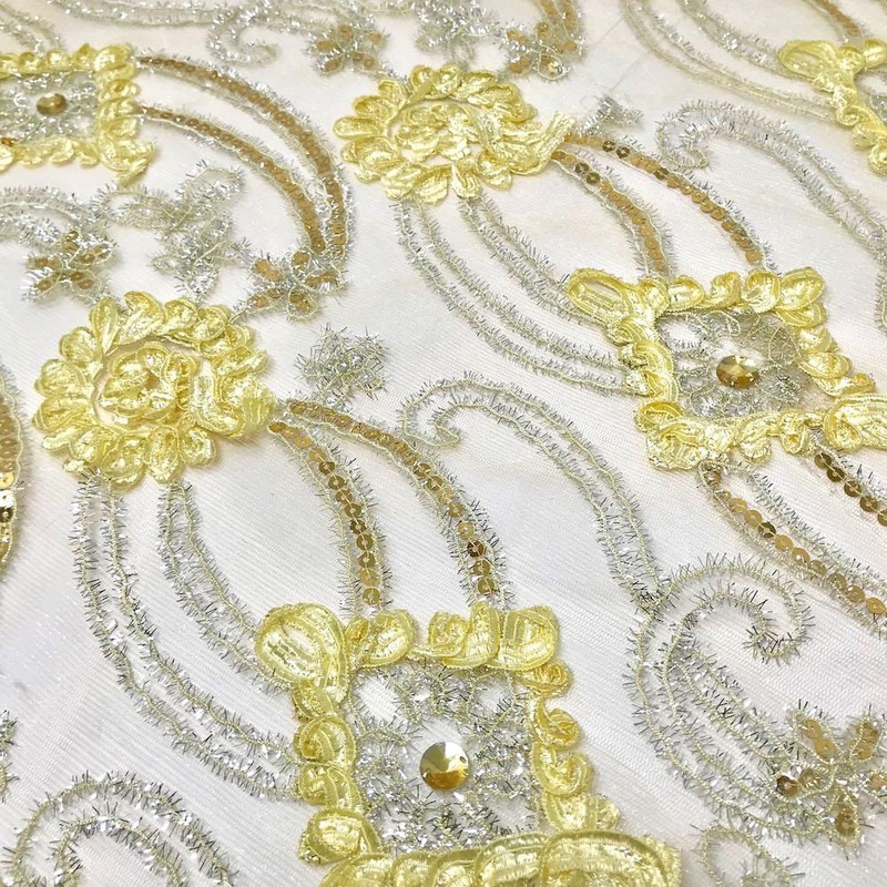 Our beautiful sunflower diamond sparkle embroidery sequins on mesh is 52″ inches wide, 100% polyester, and hand sewn. The fabric features a floral ribbon design centered with gems and small metallic eyelash fibers, which surround the design, for an additional sparkle. This dazzling fabric is sure to stand out at any event with all its sparkling features. This wonderful fabric has an elegant scalloped edge and is perfect for bridal wear, evening gowns, dresses, and more. Use this fabric to design your next dress to brighten and sparkle up your next special occasion, wedding, and more. Be sure to check out our other color variations!