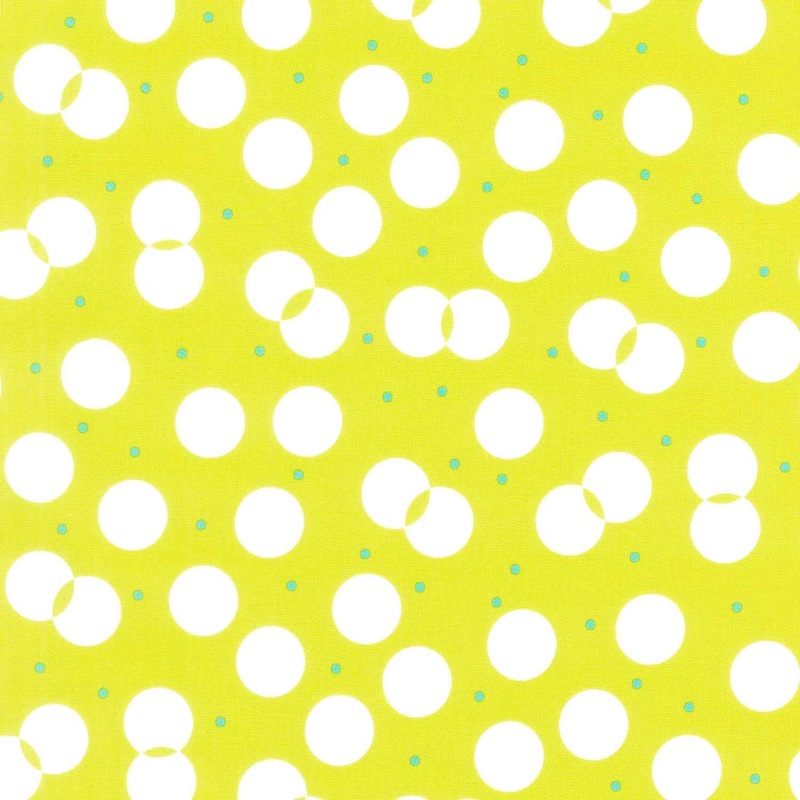 Large white dots and small blue dots on a lime background. Looking for something sweet? Youve come to the right place! Sweet and Plenty by Me & My Sister Designs for Moda Fabrics is a bright fabric collection full of bold patterns. This collection features