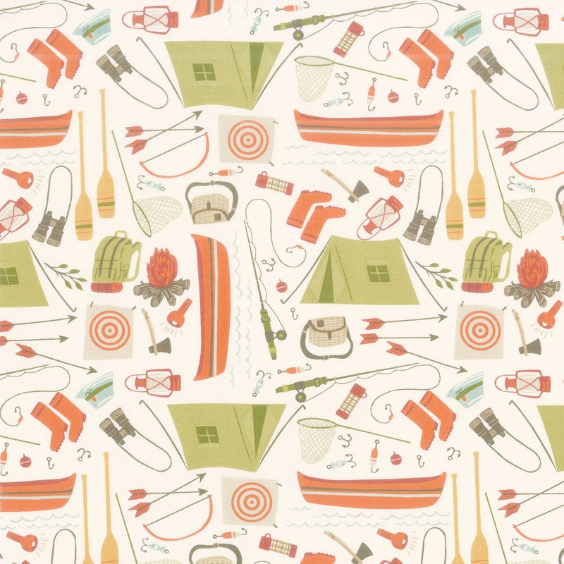 Camping gear like tents, binoculars, arrows, boots, and lanterns tossed on a cream background. Leave your hiking boots at home and get ready to reconnect with nature right in your sewing room! The Great Outdoors fabric collection by Stacy Iest Hsu for Moda Fabrics tells a story of adventure and exploration. With prints featuring adorable forest creatures, rustic cabins, and classic camping gear, this fabric will awaken your inner explorer. Get cozy with these camping-themed fabrics!