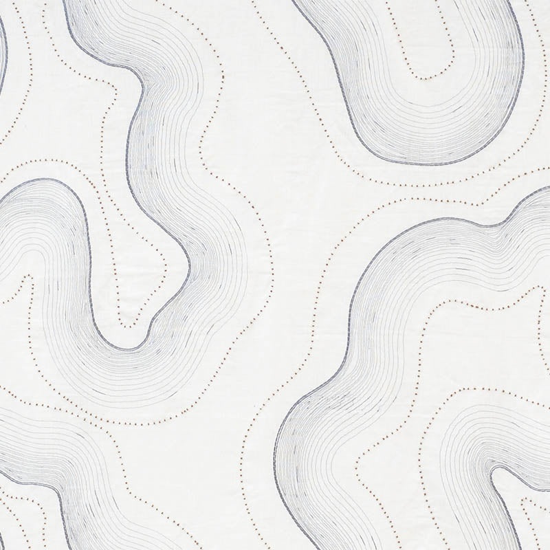 With irregular, curved forms, this abstract, undulating pattern is embroidered on a sheer linen ground and embellished with delicate beading. Topo Beaded Sheer fabric in slate color by Schumacher is a popular fabric in the Patterned Sheers & Casements coll