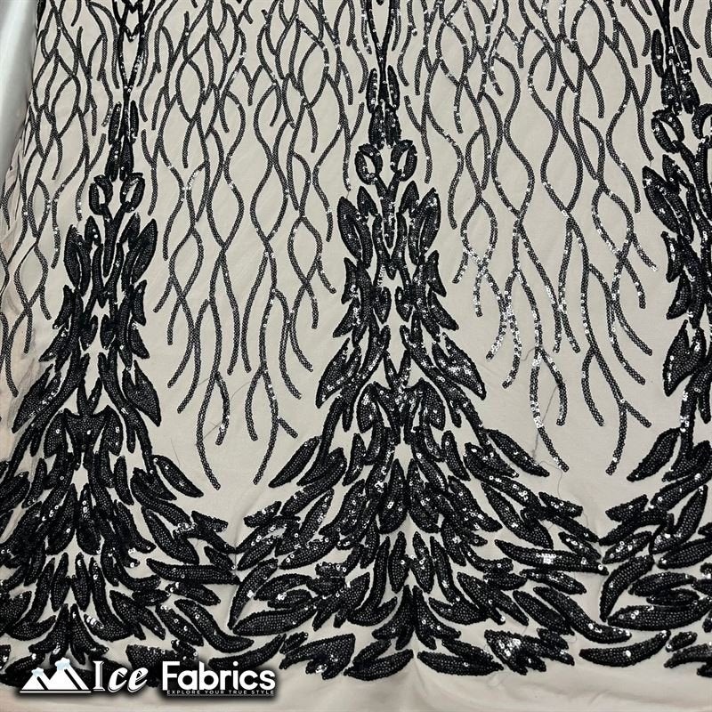 Tree Design Embroidery Stretch Sequin Fabric / Spandex Mesh By The Yard (56″ Wide) Black on Nude