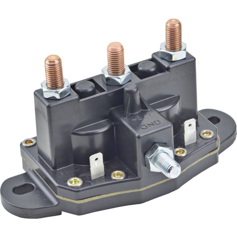 -VOLT: 24, CONDITION: New, DUTY CYCLE: Intermittent, CONTACT MATERIAL: Copper, NO OF TERMINALS: 6, : DPDT@ Motor Reversing@ (4) 5/16-24 for Battery and Terminal@ (2) 6.4mm Blade Terminals for Solenoid Operation