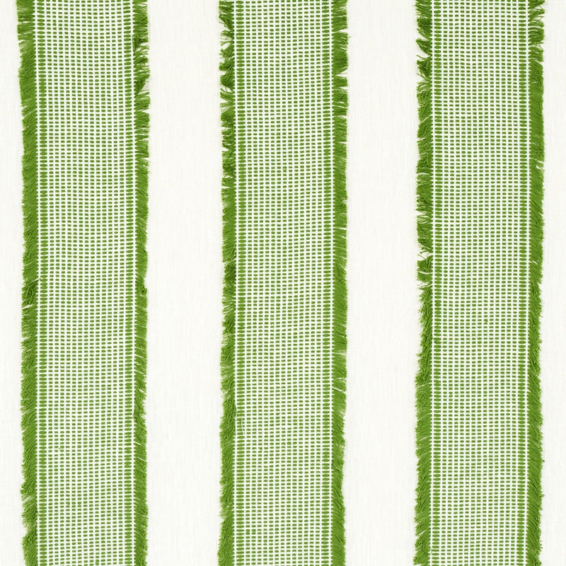Fashion comes home with this wonderfully stylish casement that has wide woven stripes and playful, hand-cut fringe. Tulum Casement fabric in green color by Schumacher is a popular fabric in the Happy Together collection. Schumacher Pattern Number 73594. Fabric World Product ID 535199.