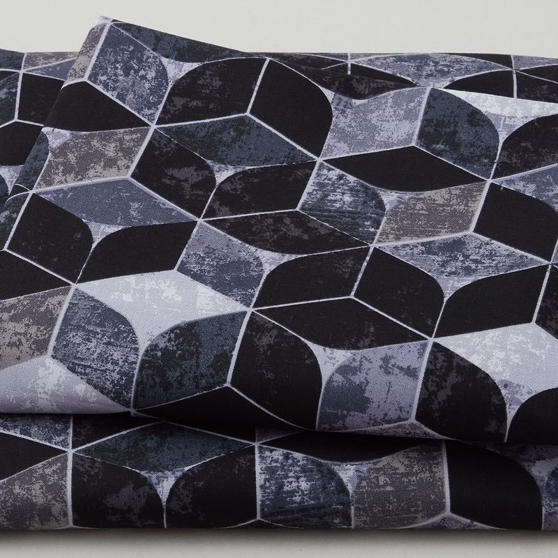 A 3-yard cut of wide backing with a black and gray block print. The Tumbling Blocks wide backings from Henry Glass Fabrics will add interest and fluid motion to your quilt. Have fun playing with blocks!